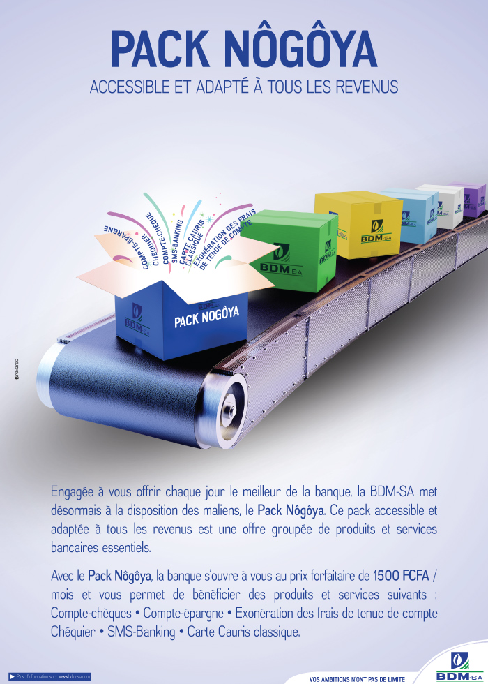 Le pack nogoya permet à ses adhérents de bénéficier des produits des produits et services basiques de la BDM-sa sur toute l’étendue du territoire. C’est une offre groupée de produits et de services bancaires de base permettant au client de couvrir un ensemble de besoins a un prix forfaitaire.